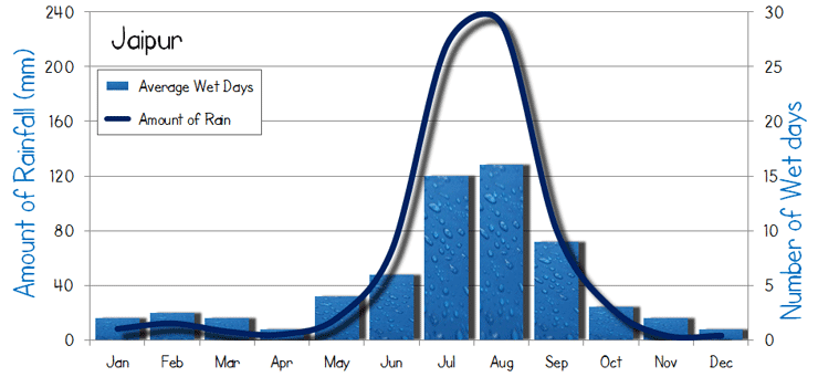 Jaipur représente une exception à la règle qui dit que les pluies de la mousson tombent pendant toute la journée; ici, les pluies ne tombent pas avant le soir, ce qui permet aux visiteurs d’explorer la ville en première partie de journée. Rajasthan est peut-être le seul état indien qui peut être visité pendant la mousson- le reste de l’Inde est noyé sous les pluies torrentielles et il vaut mieux éviter toute visite à cette période de l’année.